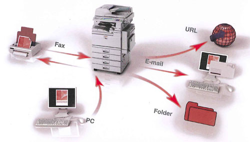 | Years ago “Copiers” were just that, for making a duplicate of an original. Today MFP’s (Multi Function Products) offers you so much more. As you will see from the above diagram you can now Scan, Print, Copy, Scan to Email, Scan to URL and Fax with Fax forwarding to PC’s and email. So you can have a complete solution offering Black only or Black and full Colour. By having an all in one system you are saving money buy utilizing only one toner source, having one supplier for parts and Service which offers simple cost control and ease of ongoing usage. By consulting us on your requirements we can pull from some of the market leaders in this field. These being Kyocera, Ricoh and Toshiba as main suppliers to RJP Technology through our line Partners. With simple desktop machines to high end Production Print systems. |